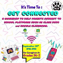 We will be hosting a workshop for parents and caregivers on 9/30 from 3pm-4pm for families with students in grades 3K-2nd, who are still having trouble getting connected to Class Dojo and Google Classroom. Please RSVP using the link below.